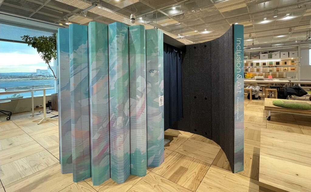 このモバイル型カームダウンブース、ノムラ センサリーフレンドリープロジェクトで開発されたプロダクトとのことで、常設用というよりも、運搬と設営が容易に行なえるようなデザインになっているようです。今回は、ソニー クリエイティブセンターが開発を進めたライブ映像・音響の刺激量を調整する仕組みと一緒に試験されているようで、本格的な運用の前の準備段階といったフェーズなのだと思います。
